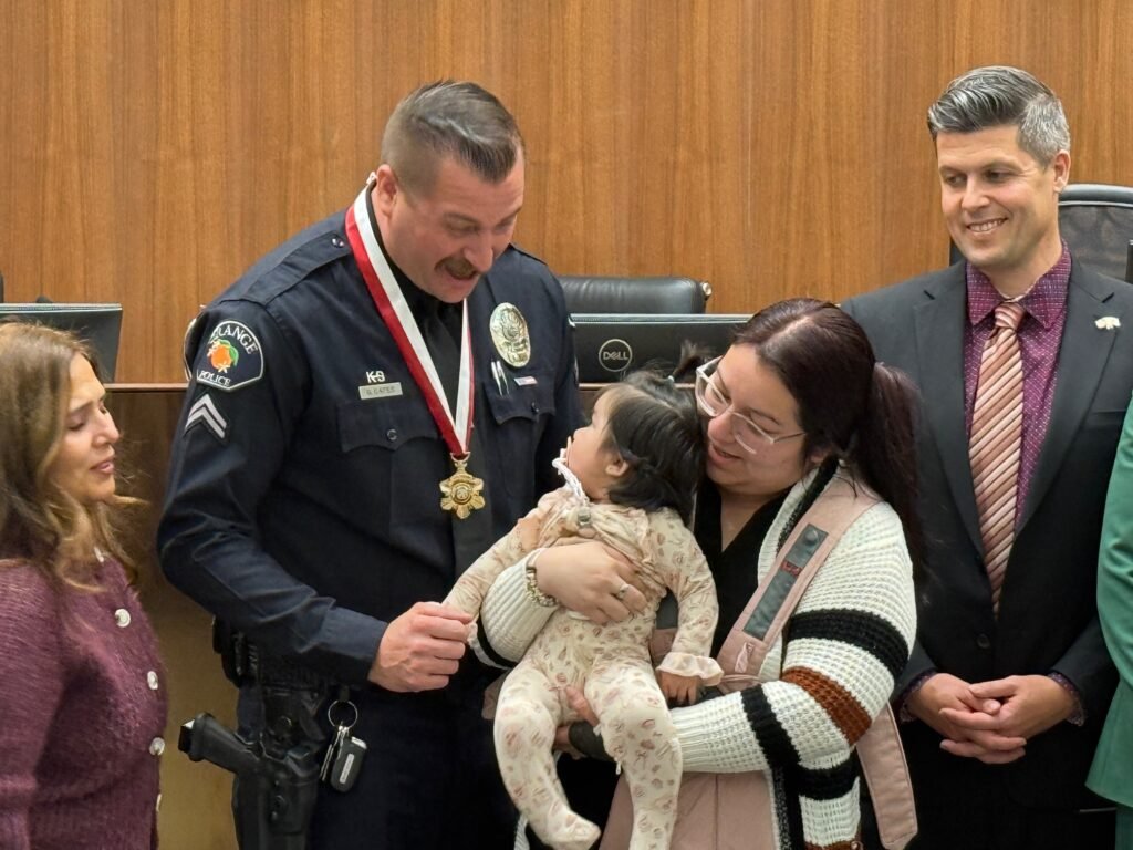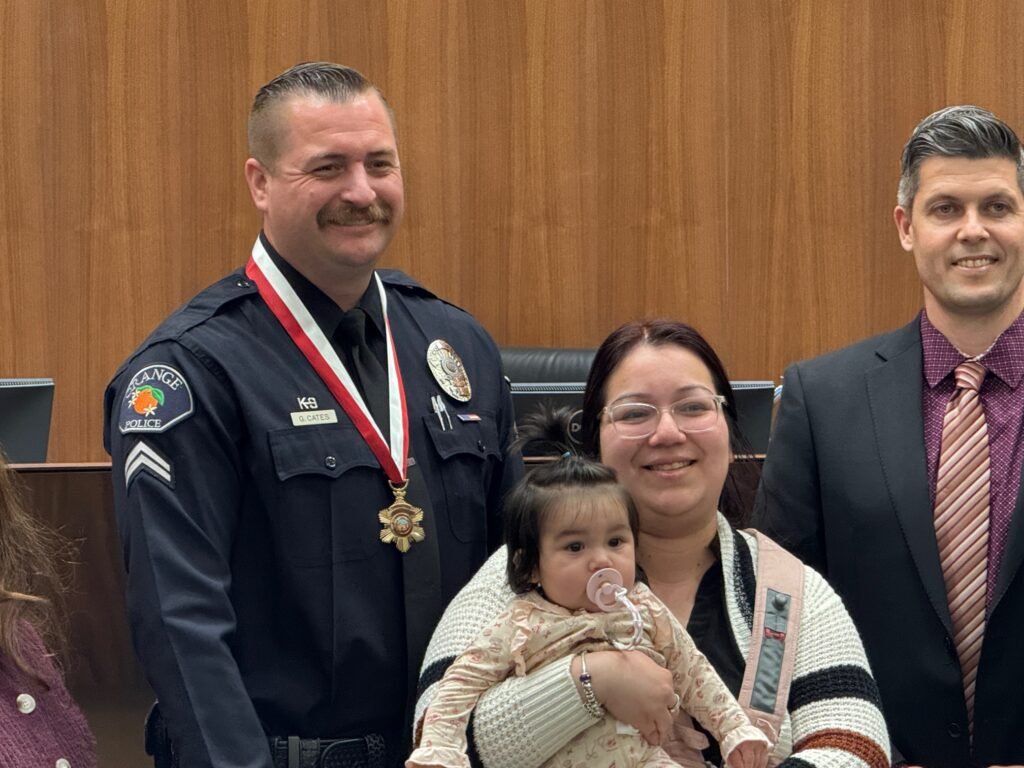 The baby and her mother were present at the meeting and thanked the Officer for saving her life. Orange Police Chief Adam Jevec placed the medal around Corporal Cates neck and congratulated him on a job well done, followed by the City Council and Mayor Dan Slater.